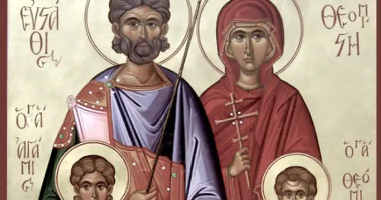Еднаш, додека ловел, Плакида подгонил еден елен. Меѓу роговите на животното, по Божја Промисла, му се јавил светол крст и глас Господов што го упатил да прими крштевање. Плакида, заедно со својата жена и двајцата синови, се крстил и добил ново име – Евстатиј. Жена му била крстена како Теопистија, а синовите како Агапиј и Теопист.