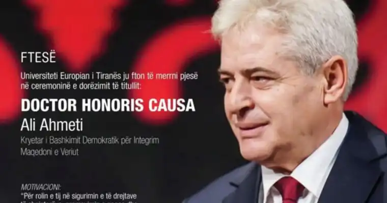 Претседателот на Демократската унија за интеграција (ДУИ), г. Али Ахмети, денес беше одликуван со највисоката академска титула „Doctor Honoris Causa“ од Европскиот Универзитет во Тирана (УЕТ).