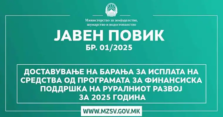 Денес е објавен Јавен повик бр. 01/2025 за доставување на барања за исплата на средства од Програмата за финансиска поддршка во руралниот развој за 2025 година.