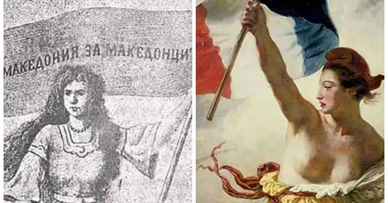 На левата страна на споделената илустрација се гледа женски лик кој силно потсетува на Маријана (Marianne) од Француската револуција — симболот на слободата, граѓанството и борбата против монархијата. За споредба, од десната страна е приложена илустрацијата на самата Маријана, каде исто така држи меч и знаме — симболи што директно се поврзуваат со републиканските и граѓанските идеали.