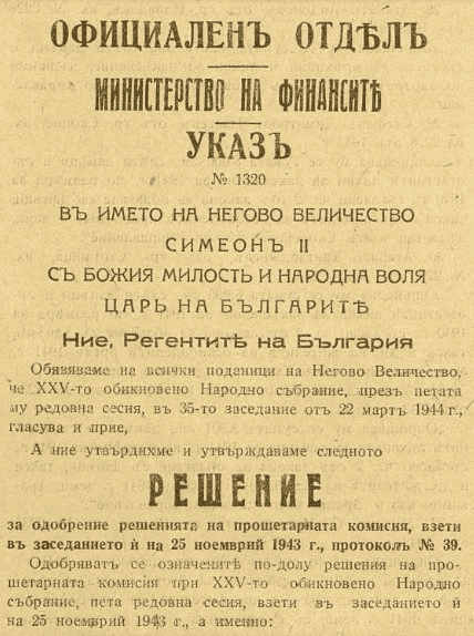Документите се објавени во државниот весник „ДЪРЖАВЕН ВЕСТНИК“, Притурка кон број 132 од 24 јуни 1944 година, во делот „Официјален оддел“ на Министерството за финансии на тогашното Царство Бугарија.