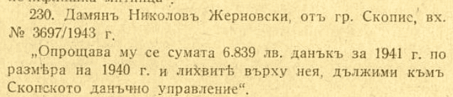 Во нив стои дека одлуката е донесена врз основа на решенија на проширена комисија при XXV-то обично Народно собрание. Конкретно, за Дамјан Николов Жерновски се наведува дека му се „опростува сумата од 6.839 лева данок за 1941 година, по размер на 1940 година, како и каматите врз неа“, кои биле должени кон Скопското даночно управување.