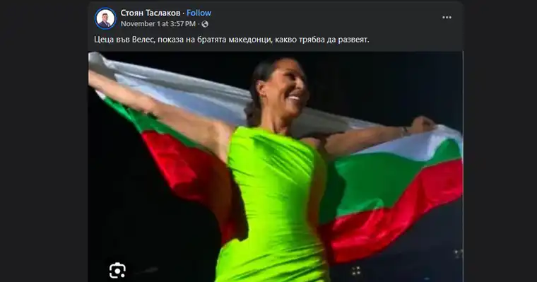 Настапот на српската фолк ѕвезда Цеца Ражнатовиќ во Велес предизвика лавина реакции — не поради нејзините песни, туку поради знамето што го развеа на сцената. Пејачката, облечена во впечатлив зелен фустан, го подигна бугарското знаме, што веднаш предизвика бурни реакции на социјалните мрежи и во медиумите.