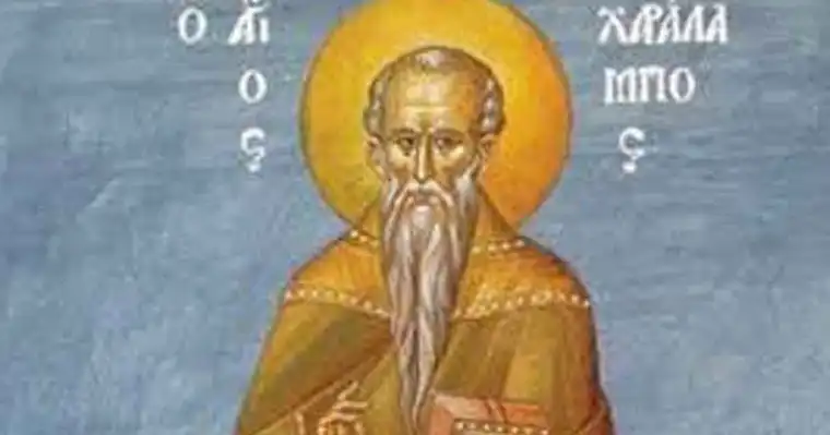 Овој голем светител беше епископ во Магнезија и во својата сто и тринаесетта година пострада за Христа. Кога настана страшното гонење на христијаните во времето на царот Септимиј Север, старецот Харалампиј не се криеше од гонителите, но слободно и јавно ја проповедаше Христовата вера. Сите маки ги претрпе како во туѓо тело. А кога уште жив му ја дереа кожата, незлобливиот светител им рече на царските војници: „Ви благодарам, браќа, зашто ми го иструживте старото тело, а ми го обновивте духот за нов, вечен живот“. Изврши многубројни чуда, во верата обрати многумина. Дури и царската ќерка Галина го напушти незнабоштвото на својот татко и стана христијанка. Осуден на смрт и изведен на губилиштето Св. Харалампиј ги воздигна рацете кон небото и Му се помоли на Бога за сите луѓе, за да им даде Бог телесно здравје и спасение на душите и да ги умножи земните плодови. „Господи, Ти знаеш дека луѓето се месо и крв; прости им ги гревовите и излеј ја Твојата благодат врз сите!“ После молитвата овој свет старец ја предаде својата душа на Бога пред да го спушти џелатот мечот врз неговиот врат. Пострада во 202 година. Неговото тело го зеде Галина и чесно го погреба.
