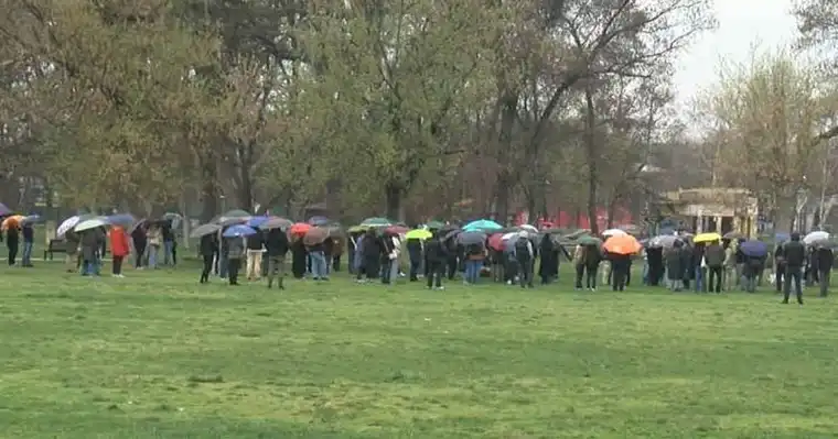 На едно дождливо скопско попладне, стотина млади луѓе се собраа во Градскиот парк за да оддадат почит на жртвите од трагичниот пожар во Кочани. Настанот, организиран преку социјалните мрежи од страна на групата „Студентски пленум“, започна во 16:59 часот со едночасовен молк, без јавни изјави од присутните пред почетокот на тивкото собирање.