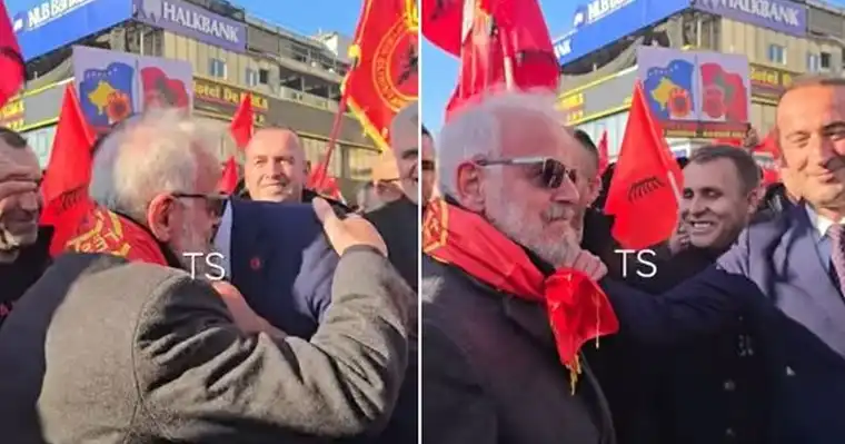 Поранешниот косовски генерал и пратеник, Даут Харадинај, му го стави шалот со симболот на УЧК на поранешниот командант и поранешен претседател на Собранието на Северна Македонија, Талат Џафери, во присуство на голем број демонстранти.