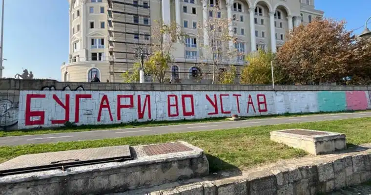 Првично, на ѕидот стоеше пораката „Бугарите – во Уставот“, придружена со бугарското знаме. Овој натпис беше дел од иницијативите за уставни измени кои би ги вклучиле Бугарите како дел од признатите заедници во Северна Македонија – дел од условите за евроинтеграцијата на земјата. Но, подоцна, групи со антиибугарски ставови го проширија натписот, додавајќи го продолжението „е предавство“.