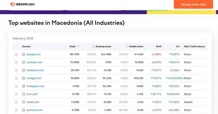Според најновите податоци од платформата SEMrush за февруари 2025 година, С. Македонија бележи еден интересен дигитален тренд – Pornhub.com се наоѓа на високото осмо место на листата на најпосетувани веб-страници во земјата, со речиси 10 милиони посети (точно 9,79 милиони).