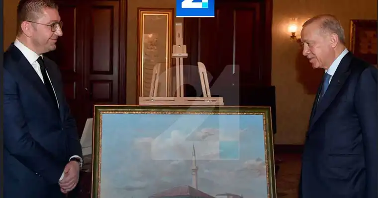 Во знак на почит кон историјата и културното наследство, Мицкоски му подари на Ердоган уметничка слика од познатата Шарена џамија во Тетово, значаен архитектонски објект кој турскиот претседател го има посетено повеќепати.