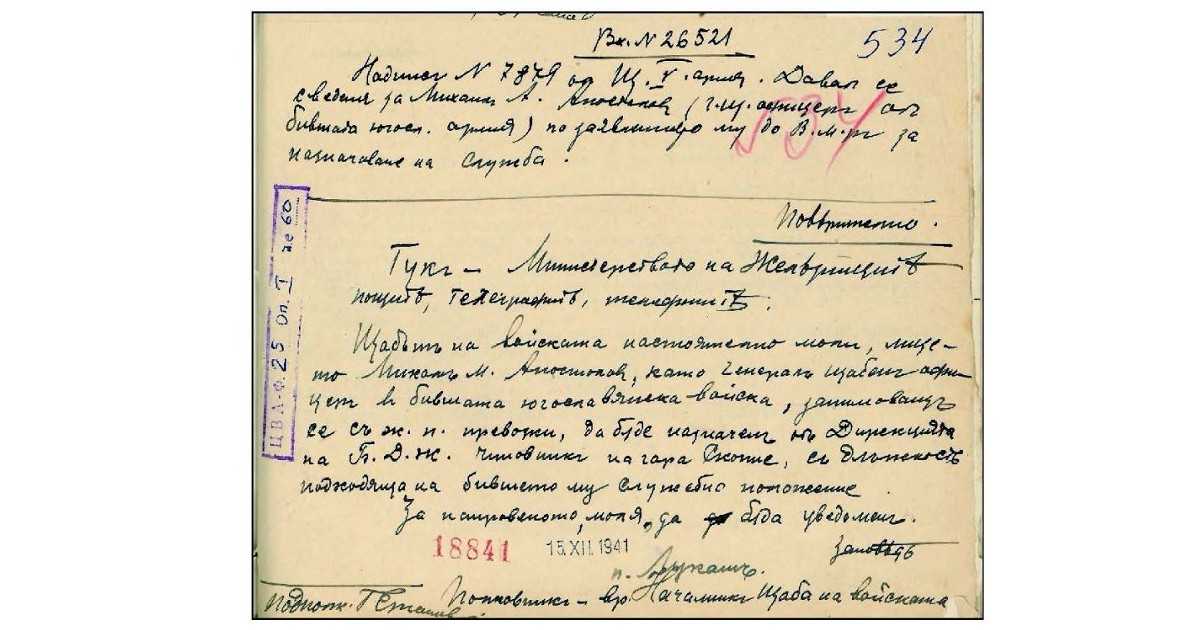 Меѓу документите од времето на Втората светска војна се појавува едно писмо потпишано од полковник Лукаш, привремен началник на Генералштабот. Во него се препорачува Михајло М. Апостолов, тогашен офицер од поранешната југословенска војска, да биде вработен во Дирекцијата на Бугарските државни железници, на станицата во Скопје. Наместо гонет „непријател“, тој во документот е предложен за работа во институција под директна контрола на тогашните бугарски власти.