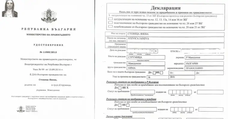 Според објавените податоци, при аплицирањето за бугарско државјанство, Стевица Јанева доставила декларација во која навела дека нејзините мајка, татко, сестра (Роза Мицкоска – сопругата на премиерот) и двете нејзини деца се Бугари по народност од Струмица. Во интервјуто спроведено од бугарските власти, таа изјавила дека има роднини во селото Брезница, Петрич и Софија.
