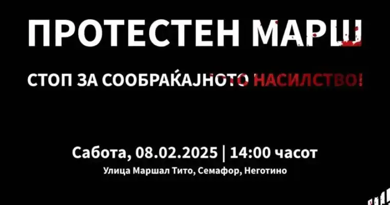 За денеска е најавен протестен марш во Неготино-„Стоп за сообраќајното насилство“. Го организираат блиските на Фросина Кулакова која беше прегазена од Васил Јованов на булеварот „Партизански одреди“ во Скопје. Целта е да се испрати порака до јавноста и да се подигне свеста за трагедиите коишто се случуваат на улиците.
