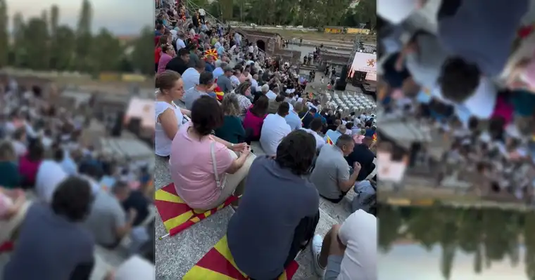 На митинг организиран од страна на политичката партија ВМРО-ДПМНЕ, се појавија фотографии кои предизвикаа бурни реакции во јавноста. Имено, дел од симпатизерите на партијата биле фотографирани како седат директно врз државното знаме на Република Северна Македонија, користејќи го како подлога на скалите од амфитеатарот каде што се одржувал настанот.