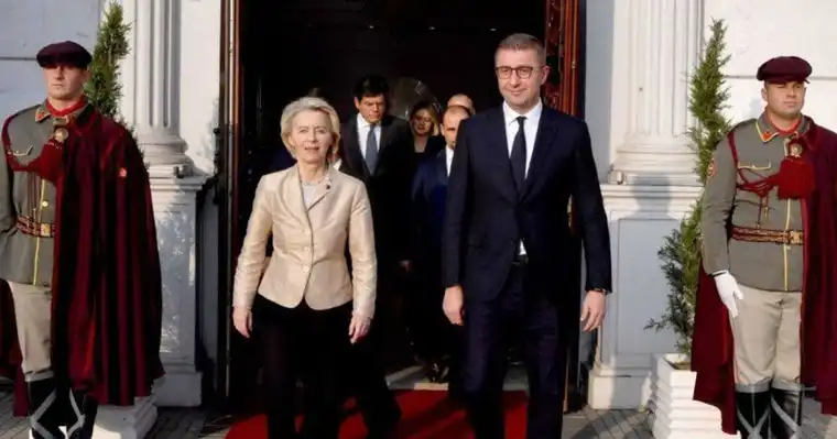 Претседателката на Европската комисија, Урсула фон дер Лајен, по денешната средба со премиерот Христијан Мицкоски во Брисел, порача дека Европската унија целосно ја поддржува Македонија на нејзиниот пат кон членство, но и дека последниот предуслов за отворање на пристапните преговори останува усвојувањето на уставните измени.