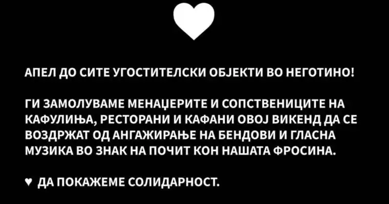 Апел до сите угостителски објекти во Неготино, викендов да се воздржат од музика, во чест на 22 – годишната Фросина Кулакова која беше усмртена на улицата „Партизанска“ во Скопје, е јавно упатен преку фејсбук група посветена на овој град.