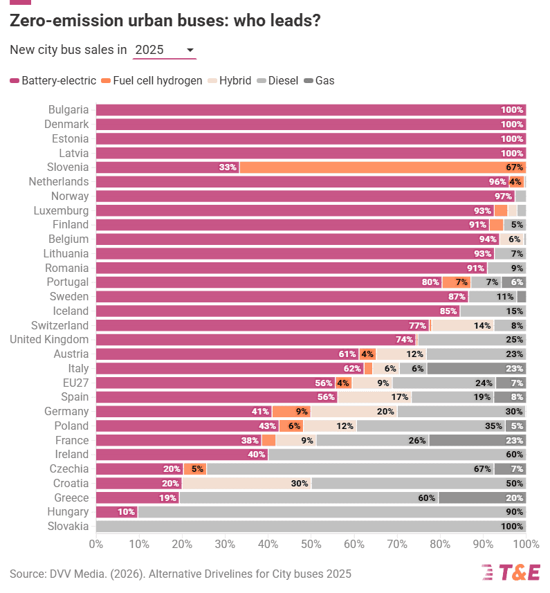 Според најновите податоци, шест од десет нови градски автобуси во Европската унија во 2025 година биле со нулта емисија. Батериските електрични модели сочинувале повеќе од половина од новите продажби, додека автобусите на горивни ќелии заземале помал, но растечки удел. Овој резултат претставува драматична промена во однос на 2019 година, кога електричните автобуси имаа само маргинално присуство на пазарот.