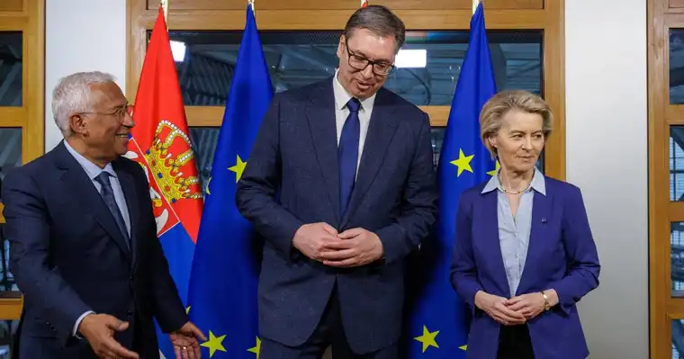 Меѓутоа, Европската Унија беше перципирана како претпазлива во поддршката на протестите, додека работната вечера на Вучиќ со врвните лидери на блокот предизвика контроверзија и во Србија и надвор од неа. Минатата недела, 32 пратеници од Европскиот парламент побараа преку писмо од фон дер Лајен да ја откаже средбата.