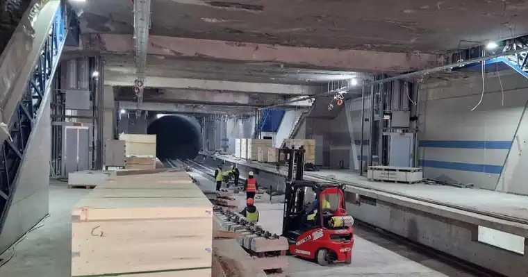 Во моментов, градежните работи се во последна фаза. Веќе се монтирани ескалаторите, а пристигнаа и заштитните ѕидови за пероните, кои наскоро ќе бидат поставени. Дизајнот на станицата е инспириран од синиот тон, кој доминира во ѕидните и подните површини, давајќи модерен и елегантен изглед на објектот.
