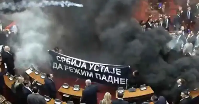 Во парламентот на Србија, по усвојувањето на дневниот ред, околу 11:15 часот дојде до судир и фрлање димни бомби, поради што набрзо целата сала беше обвиена во чад.